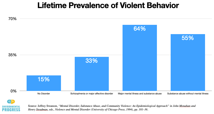 But nobody doubts the higher prevalence of violence among the mentally ill, the 96% number is deeply misleading, and America’s addiction crisis doesn’t diminish the risk of violence, it increases it. The 96% number does not differentiate between severe forms of violence, like murdering strangers, and more benign acts, like threatening a family member. As for drugs, researchers note, “The highest risk was shown for dual-disordered [mentally ill and addicted] subjects with a history of violence, who showed nearly 10 times higher risk of violence compared with subjects with severe mental illness only.”
