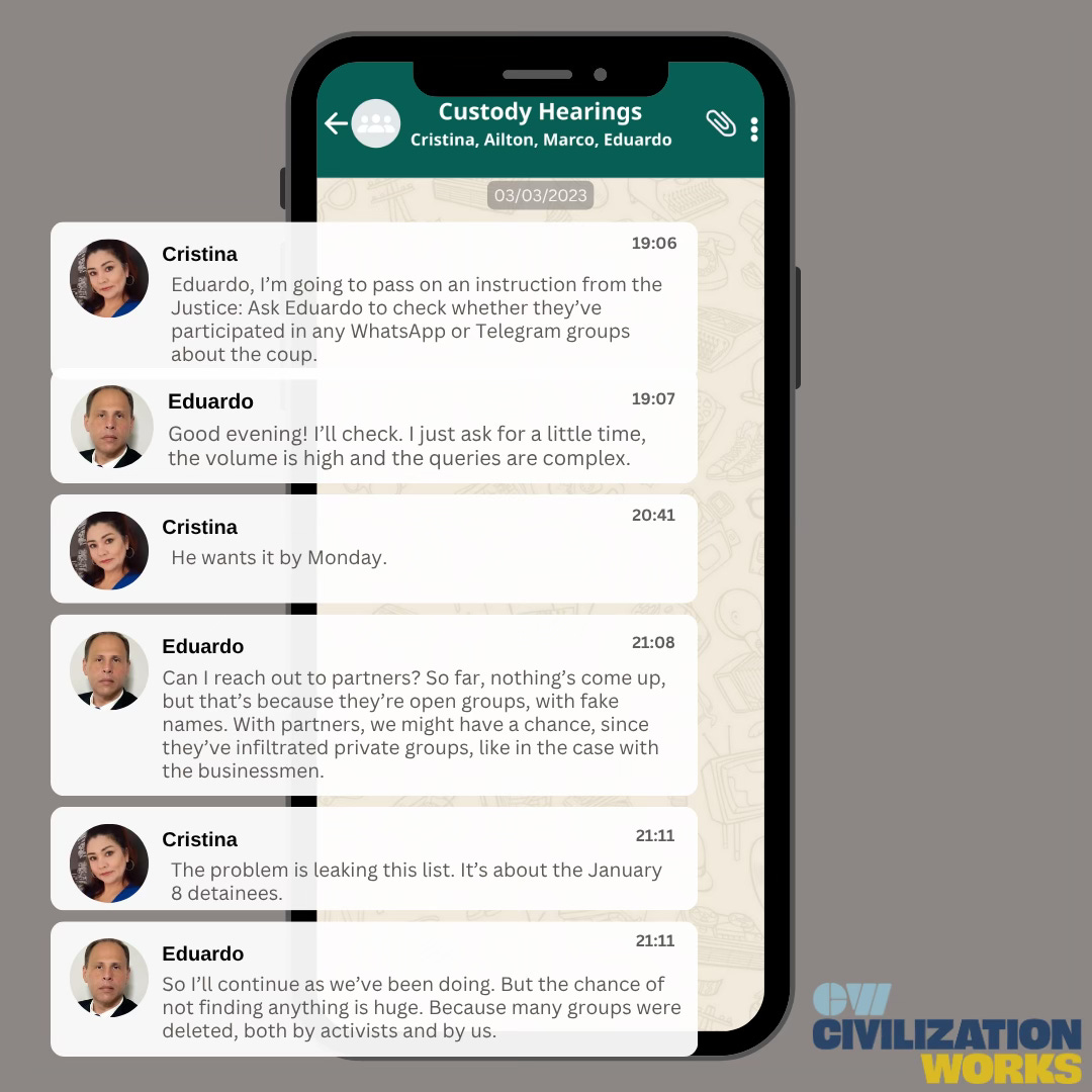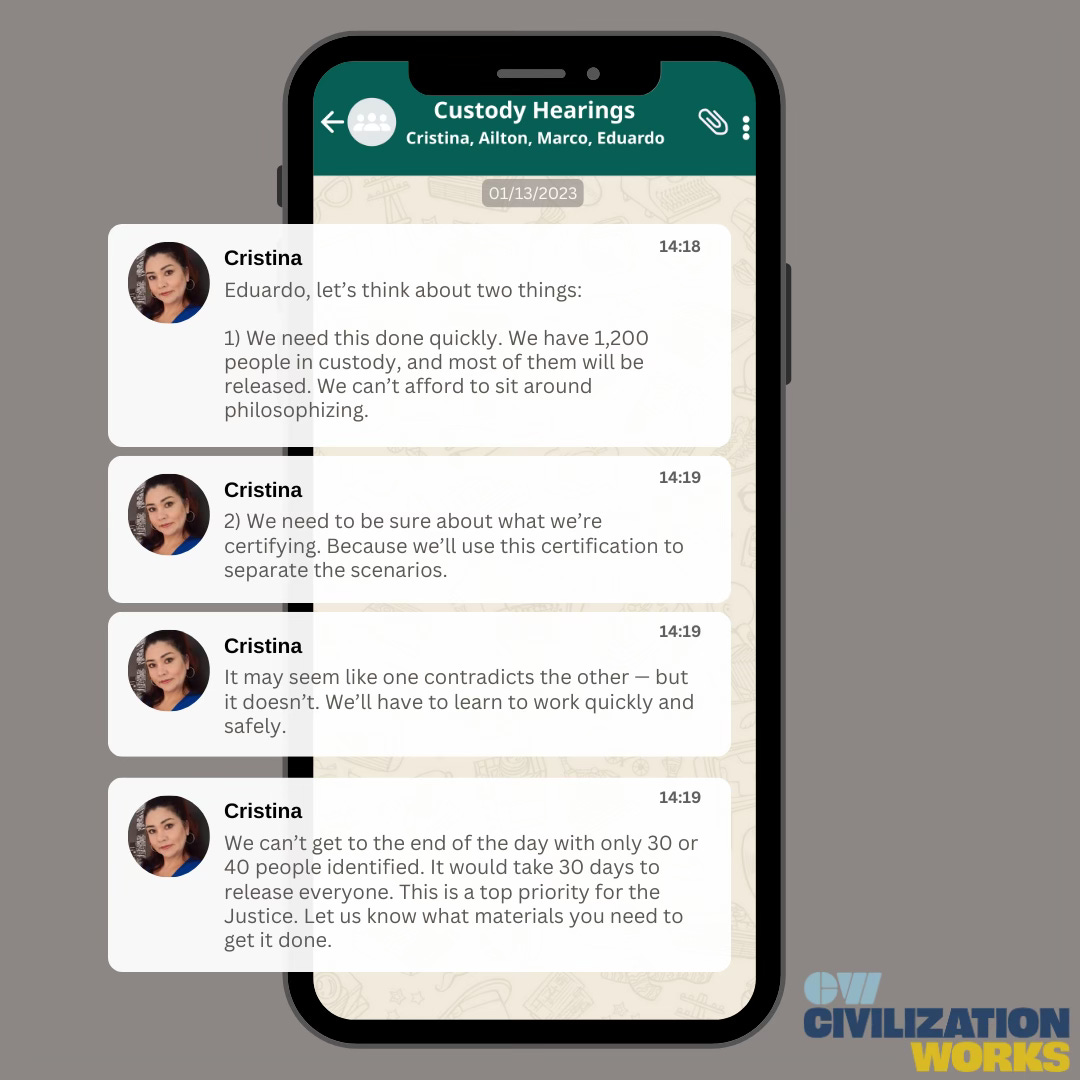 The court’s use of online speech as a secret basis for prosecution was explicit. On February 13, 2023, Moraes’ chief of staff bluntly told an internal WhatsApp group, “The Prosecutor General’s Office asked for [protesters’] release, but the Justice doesn’t want to let them go before we check their social media.”