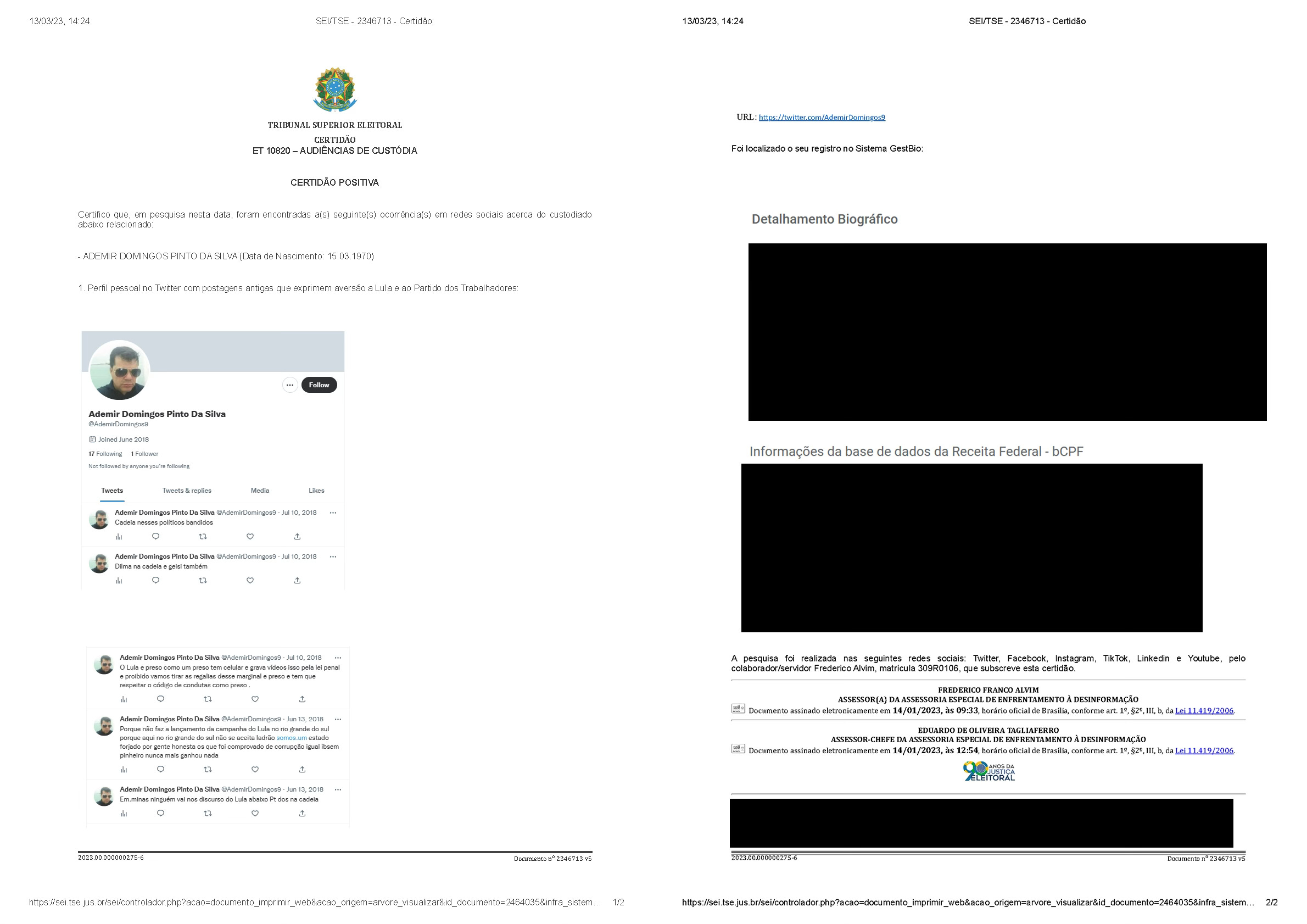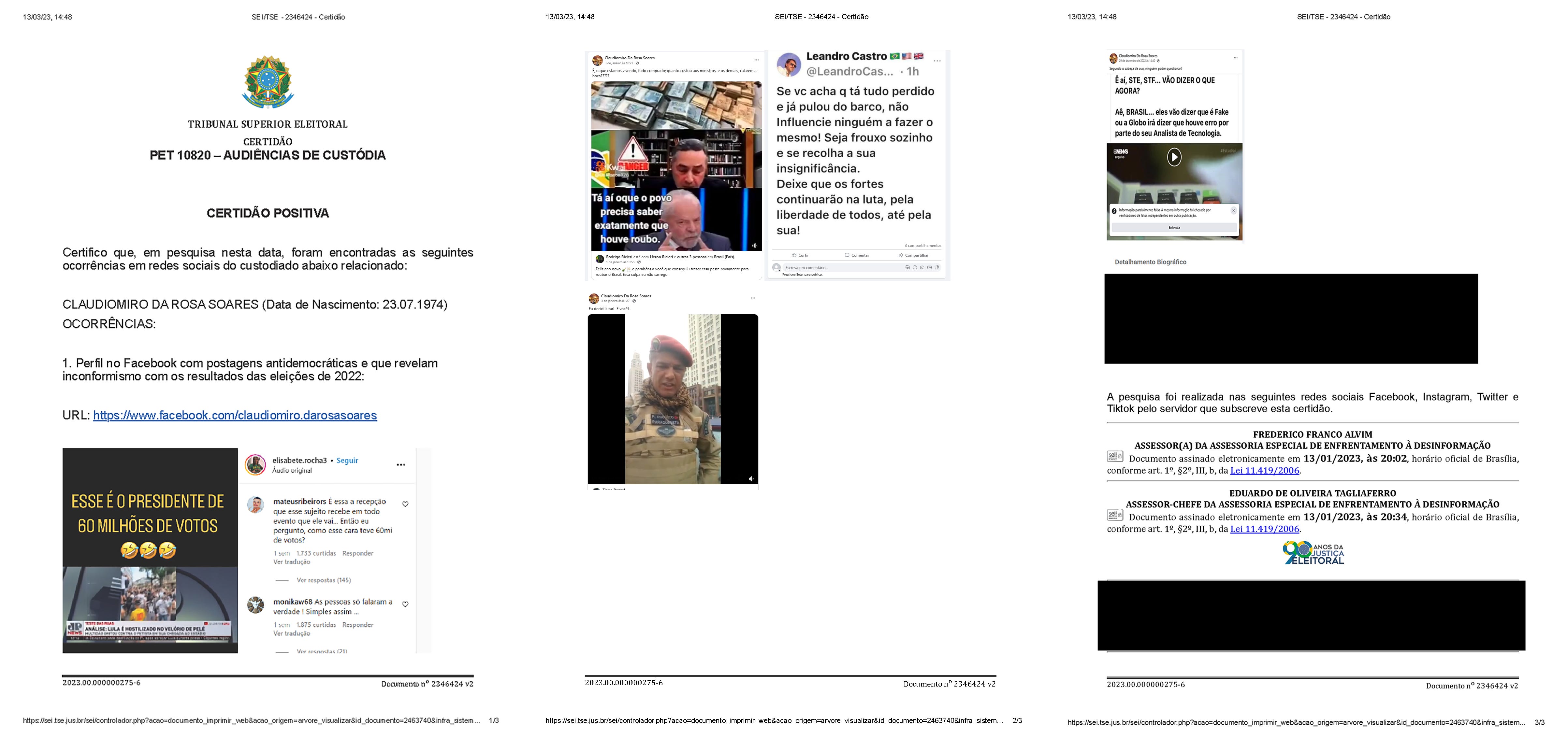 After the January 8 events, Moraes issued a formal order authorizing the use of internal Electoral Court databases by the STF. The disinformation team then used GestBio to identify protesters based on images.