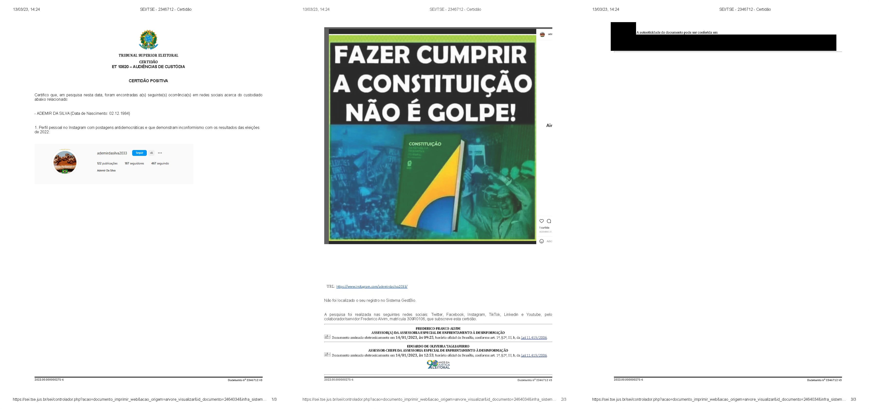 According to attorney André Marsiglia, a freedom of expression specialist, it’s illegal for the Electoral Court to produce reports that influence judicial decisions, such as the arrest or release of January 8 defendants. He argues that the task of investigating and building a case belongs solely to the Public Prosecutor’s Office, which must remain independent from the court that issues rulings.