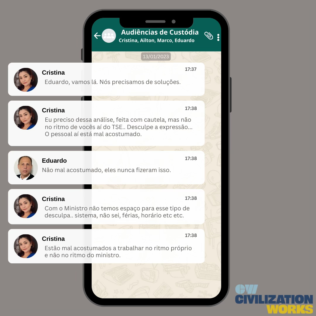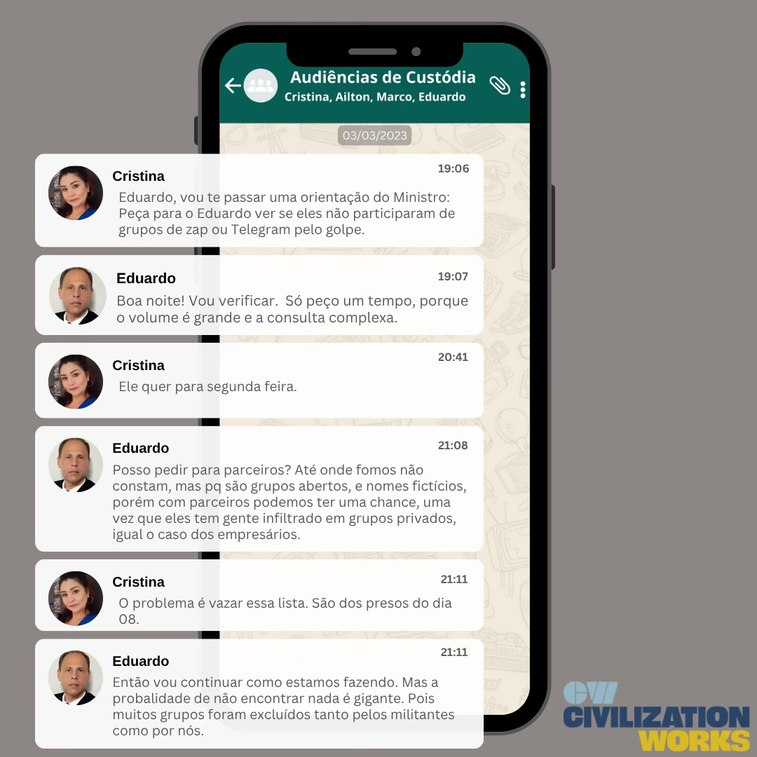 O que os Twitter Files expuseram como excepcional — a perseguição de pessoas por suas opiniões políticas — agora é revelado como um padrão pelos Arquivos do 8 de Janeiro. A última leva de certidões foi concluída em 13 de março de 2023, depois o grupo do WhatsApp ficou inativo.
