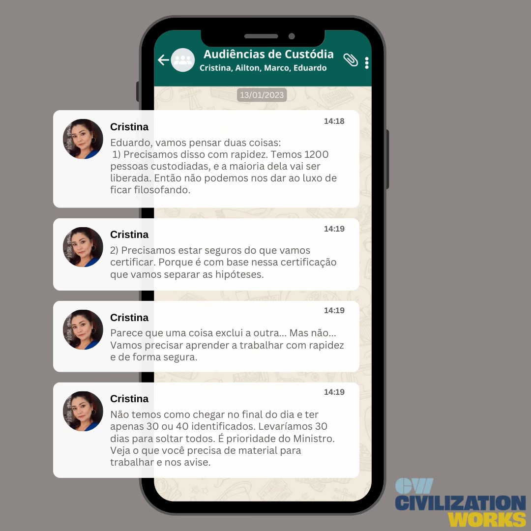 Outros assessores contribuíram para a investigação, mas raramente apareceram nas conversas do grupo. Sua missão: traçar o perfil de 1.400 detidos em massa, usando qualquer vestígio digital disponível — e fazê-lo rapidamente. O principal responsável era Tagliaferro, que coordenava alguns assistentes que produziram as certidões com base em pesquisas nas redes sociais e dados extraídos de bancos de dados do tribunal.