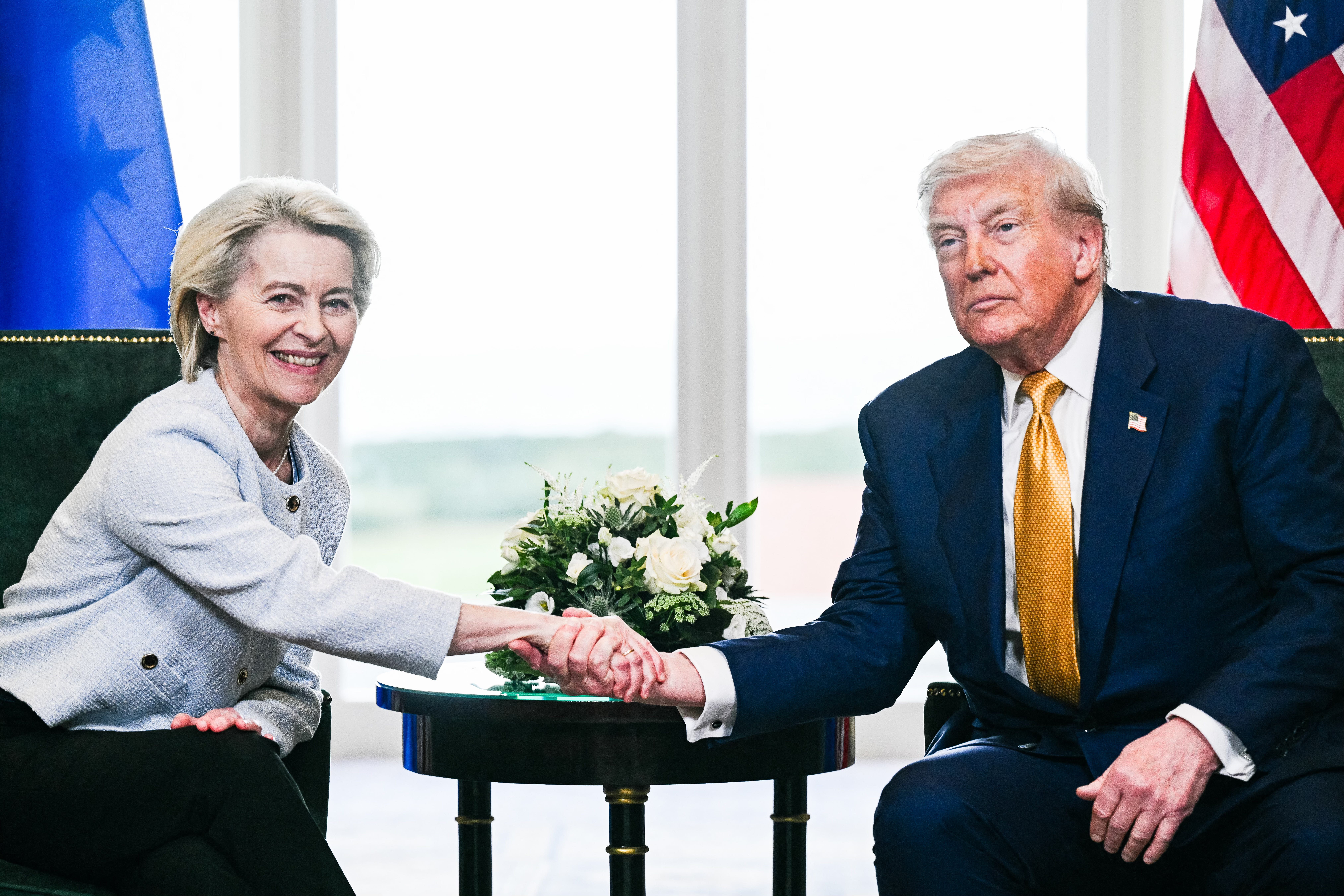 US President Donald Trump (R) shakes hands with European Commission President Ursula von der Leyen (L) after agreeing on a trade deal between the two economies following their meeting, in Turnberry south west Scotland on July 27, 2025, on the third day of his visit to the country, since his second tenure as President began. US President Donald Trump said on July 27, 2025 that he had reached a trade agreement with European Union chief Ursula von der Leyen. "We have reached a deal. It's a good deal for everybody," Trump told reporters after talks with von der Leyen at his golf resort in Turnberry, Scotland. The EU chief also hailed it as a "good deal". (Photo by Brendan SMIALOWSKI / AFP) (Photo by BRENDAN SMIALOWSKI/AFP via Getty Images)