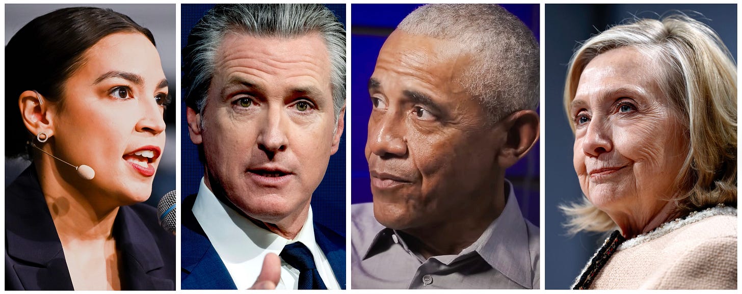 Democrats are moderating in anticipation of the midterm elections, according to many analysts. The New Democrat Coalition, a large center-left bloc of Democrats in the House, urged the party last week to adopt a “more moderate approach” focused on affordability and economic anxiety rather than “splashy populist promises.” Third Way, a center-left think tank, published polling last week showing that 55% of young men want the Democratic Party to become more moderate, while just 30% want it to move further left. In 2024, Rep. Alexandria Ocasio-Cortez removed the pronouns from her bio. After the 2024 elections, Gavin Newsom criticized trans-identifying men being allowed to compete in women’s sports. And, over the last three days, Barack Obama and Hillary Clinton, in separate events, urged Democrats to moderate on immigration, homelessness, and “virtue signaling.”