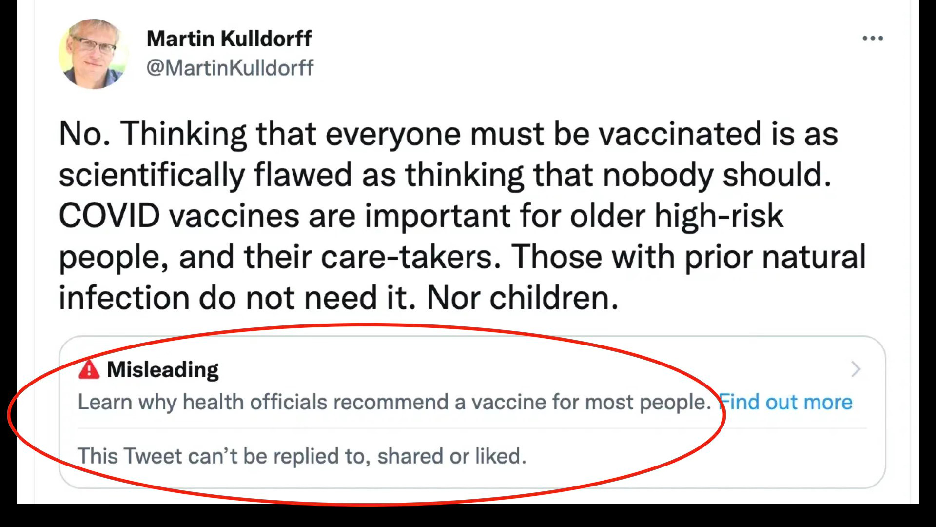 What he said was that “Thinking that everyone must be vaccinated is as scientifically flawed as thinking that nobody should get COVID. Vaccines are important for older high-risk people and their caretakers. Those with prior natural infection do not need it, nor do children.”