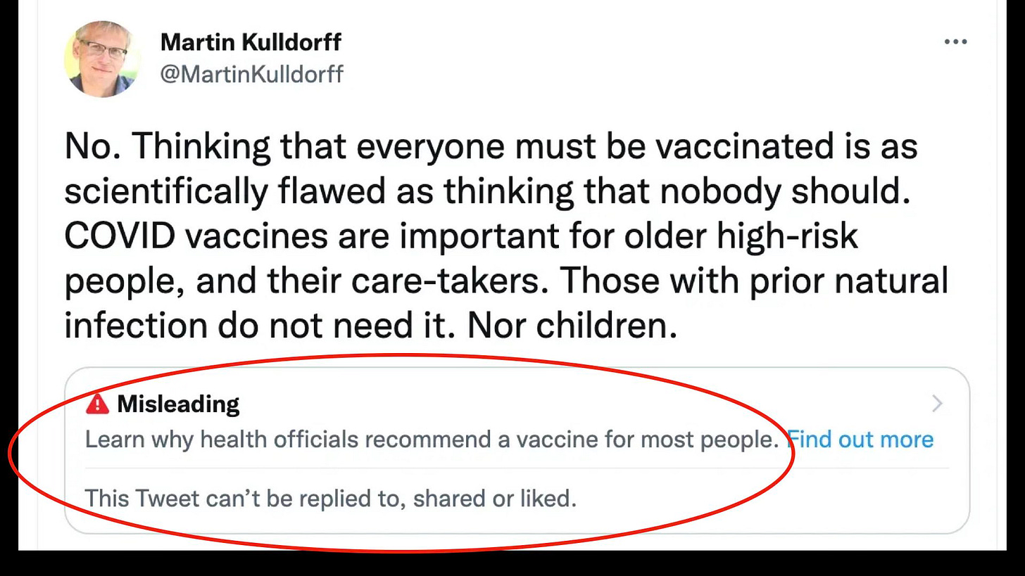 Who is Martin Kulldorff? He’s a Harvard Medical School professor for 21 years, a well-known Swedish biostatistician who developed widely used software for disease mapping, the co-author of the Great Barrington Declaration on how to deal with the COVID pandemic, and an advisor to the world’s leading health organizations.